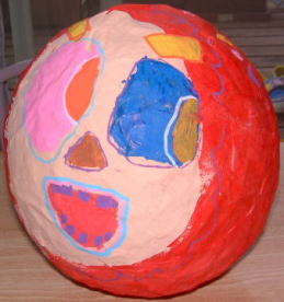 「はりこだるま」2002.5 風船をふくらませて,まわりに新聞と紙をたくさん貼りました。下の部分を切って,風船を取り出し,石をつめて「おきあがりこぼし」にしました。絵の具で色を塗って完成です。目とまゆ毛が気に入ってます。 (長女S) |