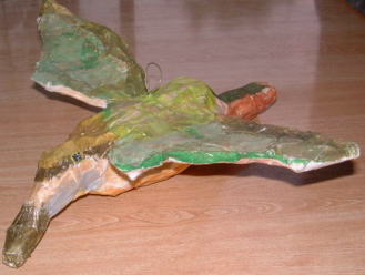 | 「はりこの鳥」2002.5 ぼくは,本物の鳥らしく作ってみました。最初はたいへんでしたが,完成した鳥を見てみると,本当に飛んでくるように作れたのでよかったです。ぼくは,この鳥をこわさないように気をつけたいです。 (長男K) |