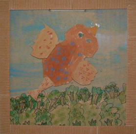 「空飛ぶ鳥」2002.5 NEW! ダンボールを使って鳥を作りました。この鳥を切るときは難しかったです。まわりの額もダンボールで作りました。工夫したところは,下の木の葉っぱの色です。葉っぱは絵の具で一枚一枚違う色に塗りました。 (長女S) |