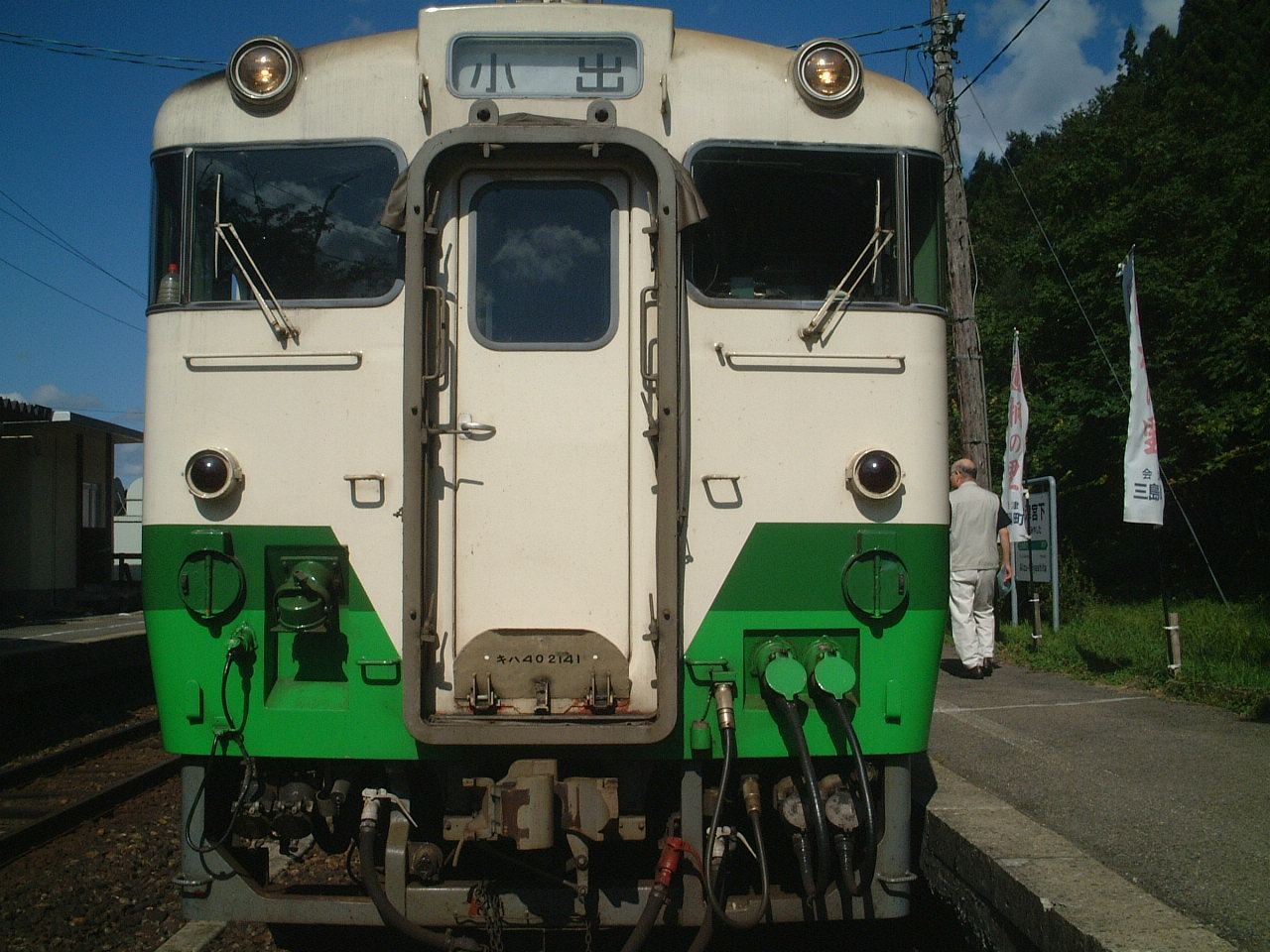 途中の「会津川口駅」のホームから左が新潟方面、右が会津方面です。写っている列車は、会津方面の対向列車です。