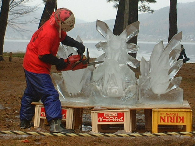 と思ったのだけど、ジェイソンさんとスタッフの方が、さらにチェーンソーで色々細かく彫ってます。そして全体に氷をおいて土台のビールケースを隠してゆきます。