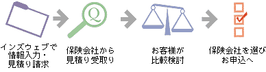 ![]() 見積り請求フォーム入力の注意点と、見積りが届いてからお申込までの流れをご紹介します。 見積り請求フォーム入力の注意点 1) 当サイト“一括見積り請求”に、あなたの見積り条件を入力してください。 途中細かい内容の入力が必要ですので、免許証、車検証と保険証券(新規加入の方は不要)をお手元にご用意ください。 2) 入力し終えると、参加保険会社の中から見積り提供可能な保険会社のロゴが現れます。(条件によってはお引受できない場合がありますので、全ての会社のロゴが現れるとは限りません。) 3) そのロゴの中からお好きな会社を選び(何社でも)、Eメール・FAX・郵送・電話の中からお好きな方法で見積り請求することができます。 見積りからお申込まで “一括見積り請求”にて入力していただいた条件をもとに、数日中に見積りが送付されます。 お申込は直接保険会社又は保険代理店にお願いいたします。 |