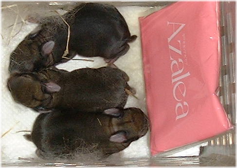 11月11日 20:02撮影。 大きくなりました。 ちょっとだけ、毛が生えてきました。 頭のあたりの毛の色をみると、やはり、チェスナットのようです。 チェスナットの子ウサギは、かわいいですよ。 (しゅん太オジさんは、とってもかわいかったです、昔も今も。)
