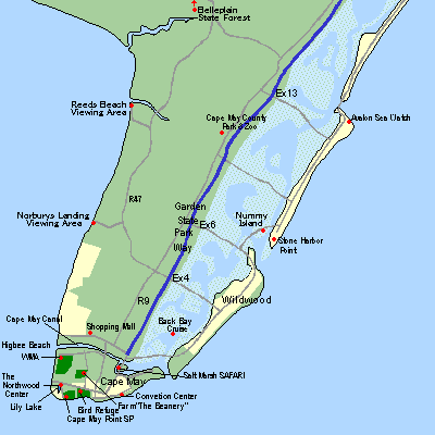 前回にもお話しましたように,NJの夏鳥(笑)は, 平地の大きい森の湖が狙い目です. そこで,岬先端に乗り込む前に Belleplain State Forestに寄ることにしました. 左の地図では中央の少し上になります. ここは相当大きな森で,中央には良い感じの湖と遊歩道があります. NJオーデュボン協会のパンフレットでも良いと書いてありまして決めました!