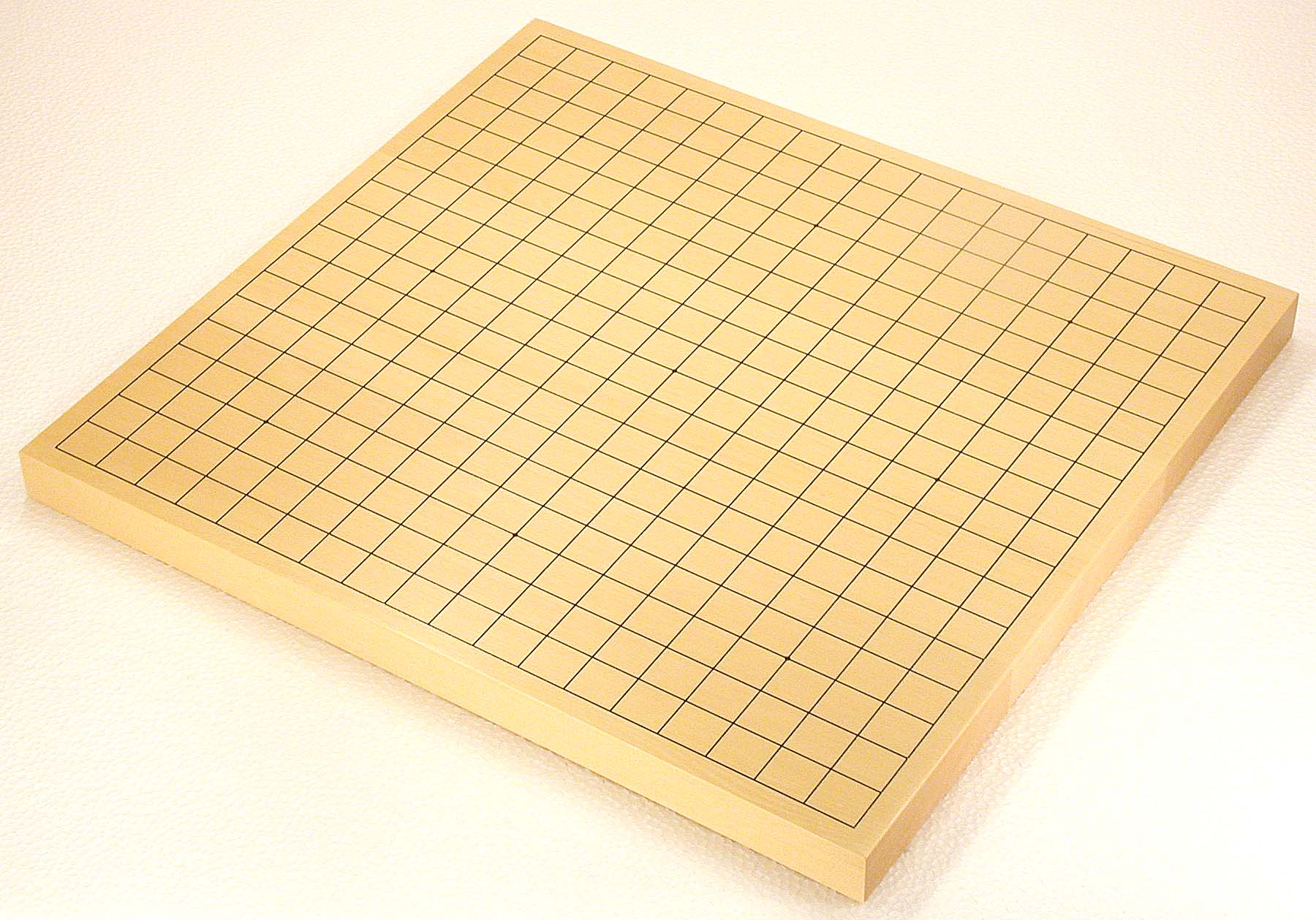 碁盤/ひば材/1寸/柾目継ぎ(特上) 生地は、細やかできれいな柾目(まさめ)継ぎの仕上げです。盤の厚さは約3pです。 ¥16,000(税込み) (写真内の 碁盤の線 が屈折したり、点々と光っているのは、撮影用の照明ライトの反射です) |