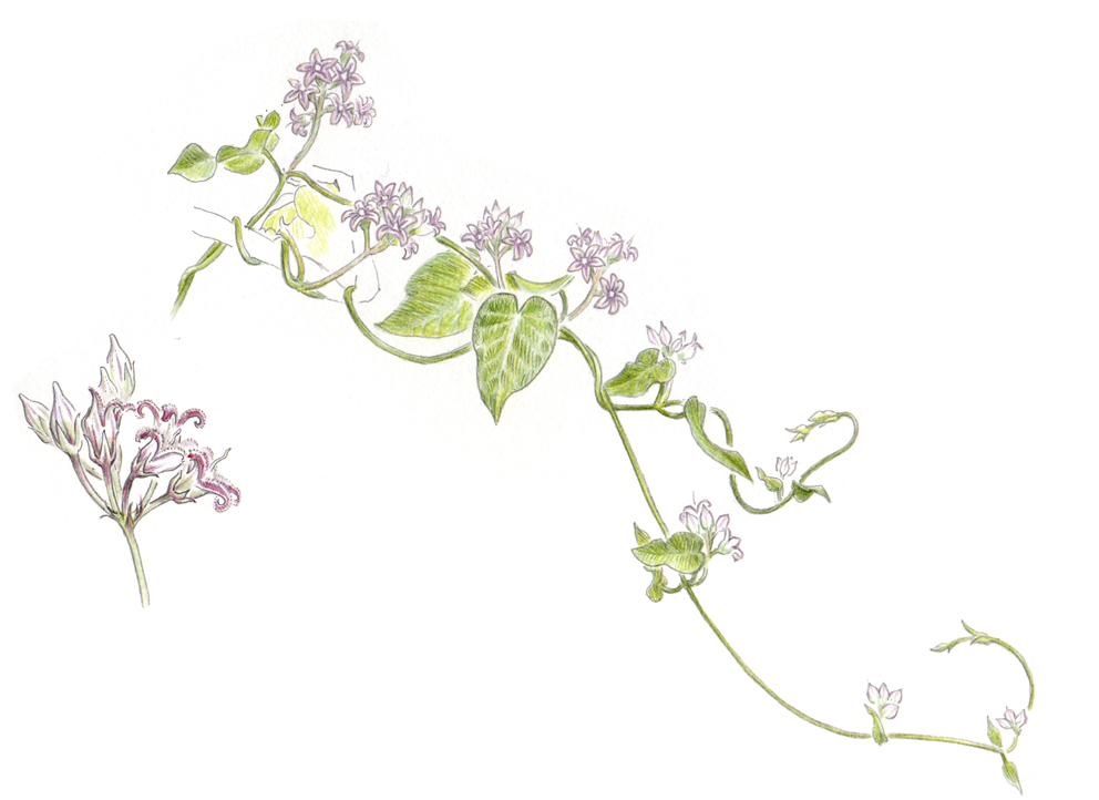 2009年、8月29日にスケッチ。近所の公園で花を咲かせていたガガイモです。ツル植物で長さは2メートルかそれ以上でしょうか? ススキなどに巻き付いて長々と生えていたので正確なところは分からず。体には細かく、小さな毛が、綿を広げたように少し乱雑に生えています。全体的に少しだけ青みがかっているように見えるのはそのせいでしょう。