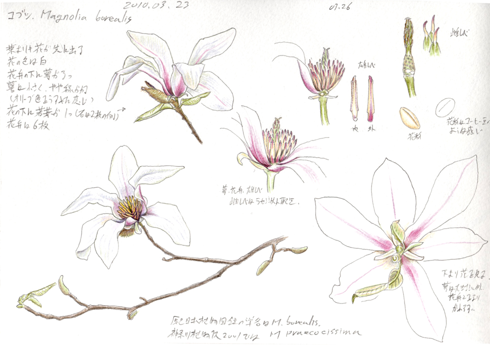 身近なマグノリッドクレードのひとつであるコブシです。スケッチしたのは2010年3月23〜26日。早春に10センチ程度の白い花を咲かせる樹木ですが、樹高はシラカシなどのようには高くなりません。また、落葉樹であり葉っぱよりも先に花を咲かせます。似た種類が幾つかありますが、落葉樹であること、春先に葉っぱよりも先に花を咲かせること、花には3枚の萼があること、萼は花弁よりもずっと小さいこと、通常、花が咲いた時、その下に1枚の若葉を持つことなど、以上の特徴を組み合わせ持つことで区別が可能である様子(参考「原色日本植物図鑑 草本編[ii]」保育社)。