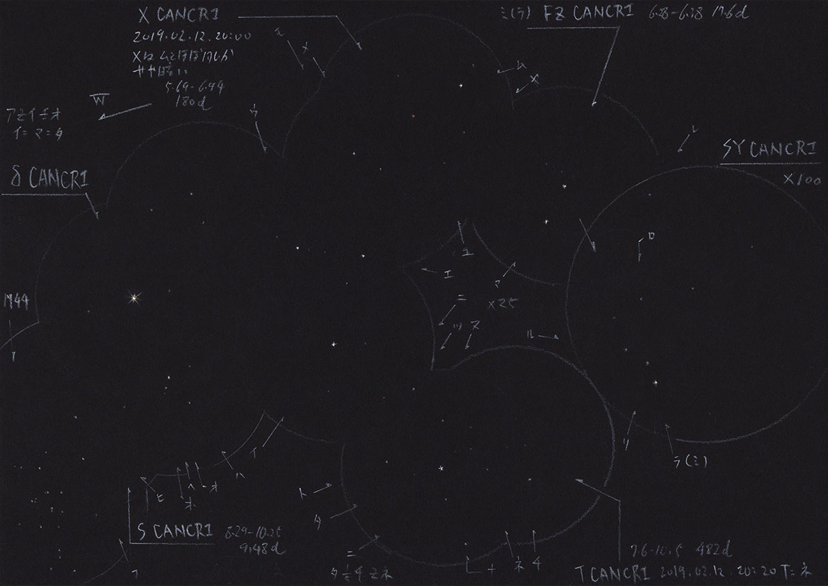 連なった小さな円は25倍の視野を示し、左下はプレセペ星団、その上にかに座δ(デルタ)星、そして周辺の星々が描きこまれています。スケッチは口径125ミリで行いました。だいたい4・5度四方の星が見えていますが、この中に変光星が五つあります。プレセペとδ星の間にあるS星。そこから北東へ3度いったところのT星。同じく東へ3度いったところにあるX星。そこから1・5度離れた場所のFZ星。そしてそのすぐ近くに矮新星SY星があります。スケッチ右のやや大きめな円は100倍の視野を示し、SY星の周辺を描いています。視野内の明るい星はFZ星。スケッチは2019年2月12日のもので、この時、SY星は見えていません。