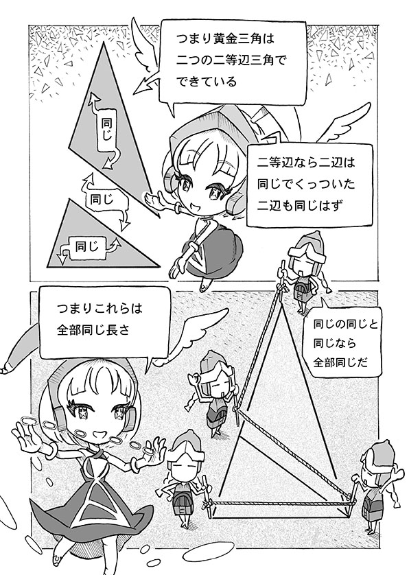 ピタゴラスが教団のシンボルとした五角形と五芒星。五角形の頂点をそれぞれつなげると内部に五芒星が現れる。それは同じ三角だけで構成された図形であり、その三角もまた、いくら分割しても同じ三角が現れる黄金分割可能な図形。すなわち、黄金三角であった。五芒星を研究した古代ギリシャの人々はこの黄金三角が二次方程式で記述できることに気がついた。これが「幾何原論」第4巻命題10の内容である。二次方程式の解き方は「幾何原論」第2巻命題11を用いれば良い。以上を応用してプトレマイオスは五角形の作図法を編み出し、五角形の辺を求めることに成功した。あとはプトレマイオスの定理を用いて五角形から六角形を引き算し、それを分割して3度の比を求めれば良い。これを達成したプトレマイオスの手によって、ついに人類は三角関数を獲得し、分度器を作り、自在に角度を測れるようになった。そしてその使用目的とは星占い。教団のシンボル研究を応用し、占術使用を目的として編み出された。詰まるところ三角関数とは、魔法の魔法による魔法のための数学だったのである。