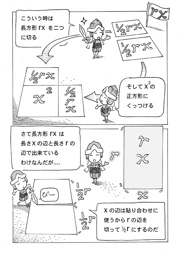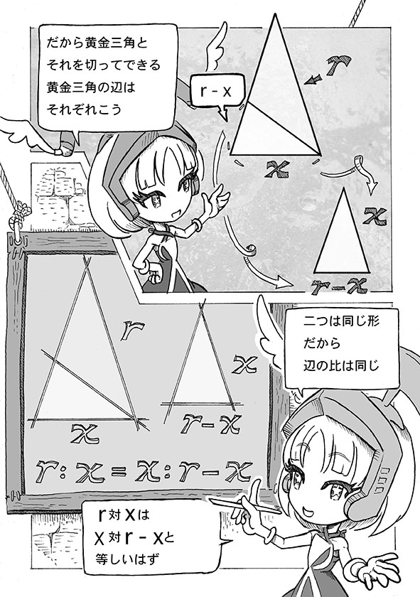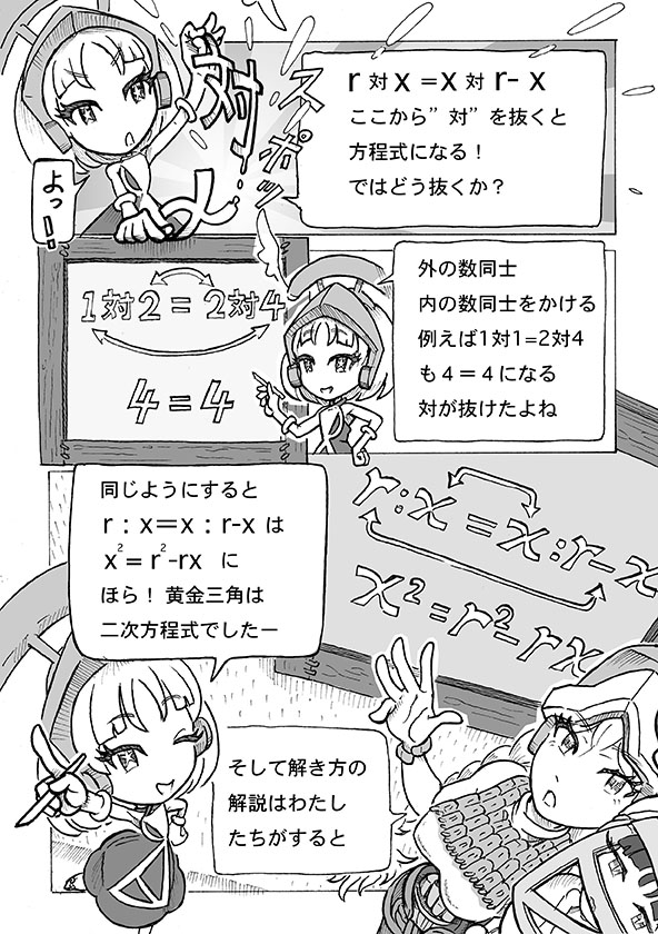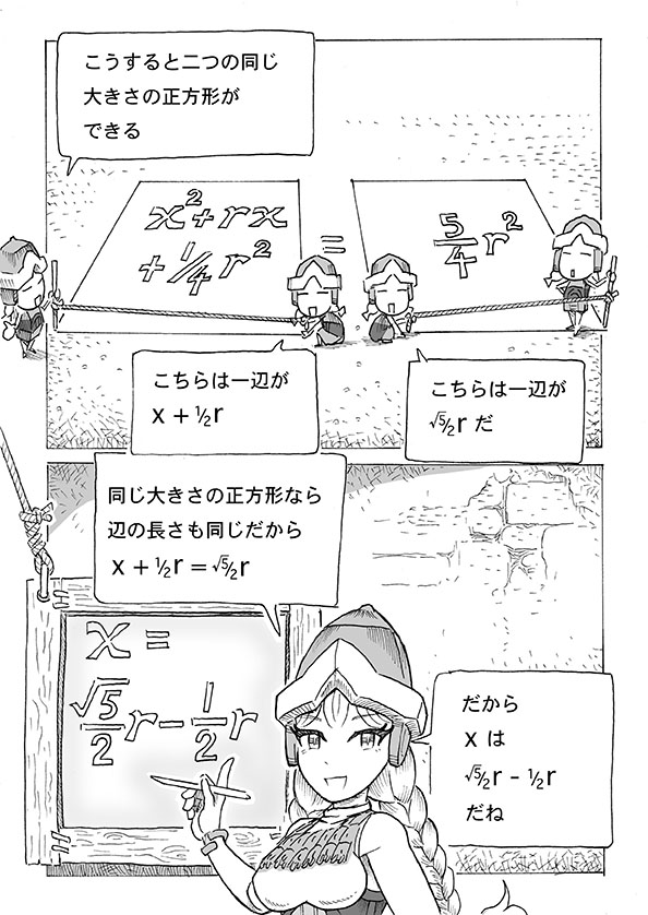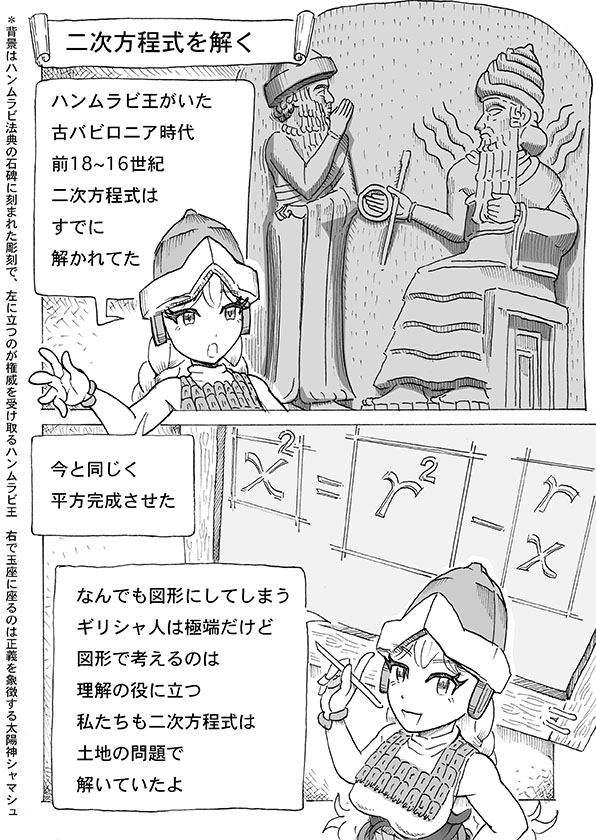 なお「幾何原論」を書いたエウクレイデス(英語表記 Eukleides)も本来からかけ離れたユークリッドの呼び名で知られている。あまりにこの呼称が一般化したので、この漫画でもユークリッドで表記させてもらっているのだが、本来の読みはエウクレイデス。ユークリッドは英語なまり。英語圏の人はeuをユーと読むのでこういうなまりが生じた。日本人のアルファベット読みはラテン語に基づいているのでむしろ本来の読みであって、英語読みは日本人から見てもローマ帝国の人から見てもいささか異様である。ラテン語読みではeuは普通にエウと読む。