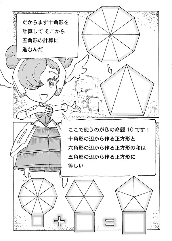 プトレマイオスは五角形の作図にあたって「幾何原論」4巻命題10で把握された黄金三角の特徴を、2巻命題11を用いて二次方程式として解いた。しかしこれで算出できるのは十角形の値である。そこで「幾何原論」第13巻命題10、すなわち”十角形の辺と六角形の辺は五角形の辺と直角三角を作る”を用いる。こうして五角形の辺を導くことが可能だ。これを幾何学で表すと漫画のようになるのだが、作図はあくまでも幾何証明であり、プトレマイオスが行ったのは計算であった。