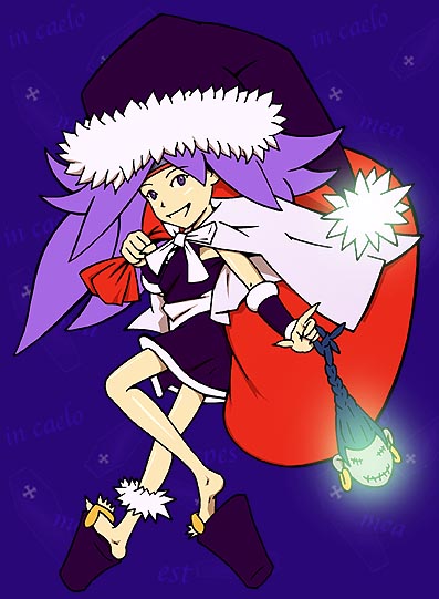 2004年12月24〜25日 黒いサンタわらしちゃん 2004年12月24〜25日にトップを飾った黒いわらしちゃん。背景が黒いせいかあまり寒そうではありませんね。背景の言葉はラテン語で、たしか、私の希望は天にあり。 ←わらしちゃんギャラリーに戻る