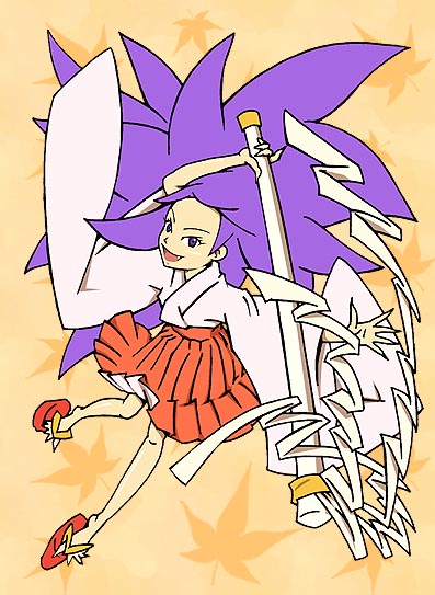 巫女さんだけにお祓いします。悪霊退散と、どでかい棒を振り回して力づくで。これ以降わらしちゃんは髪型がオールバックに。