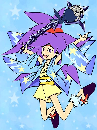 2005年七夕 七夕わらしちゃん 2005年の夏から秋にかけてトップを飾ったわらしちゃん。干し首をあしらった武器を振り回して星空をジャンプ。 ←わらしちゃんギャラリーに戻る