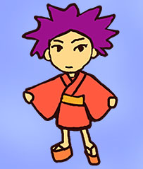 これは比較的中間的なわらしちゃん・・・・・。 さらに2003年からは髪型も変わりました。 上は2003年、3月ごろから使いはじめたわらしちゃん解説バージョン2.01。髪型が変わったのは特徴があったほうがいいのでは?、という知人の一言が原因です。頭身があがっているのは北村が3頭身キャラを描くのがへたなので、いつのまにやらこうなってしまいました・・・。