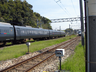 お地蔵さんの目線で線路を見ると、上り列車は左から右へ、下りは右から左へと猛スピードで走り去っていく。。目玉を左右に動かし続けるお地蔵さんもお疲れでしょう。みやげに、目薬を持参するべきだったと後悔した。