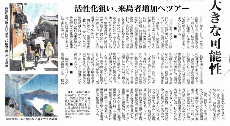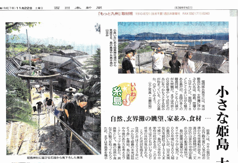 11月22日の西日本新聞朝刊は、「小さな姫島 大きな可能性」と題して糸島市沖の玄界灘に浮かぶ姫島を報じていた。