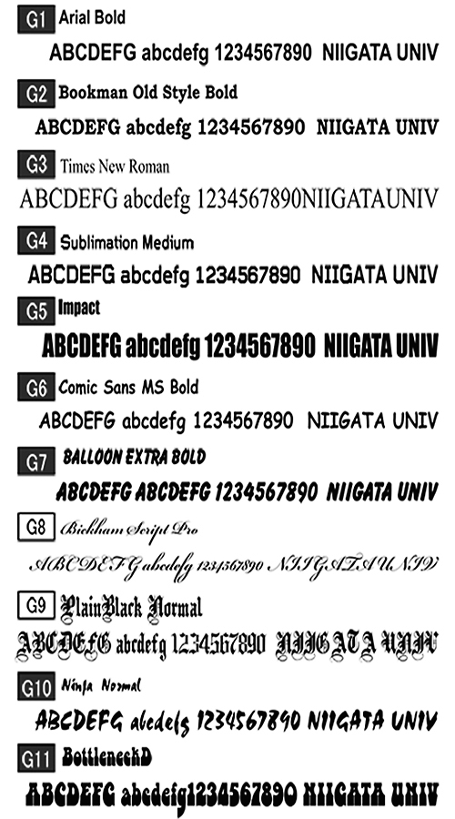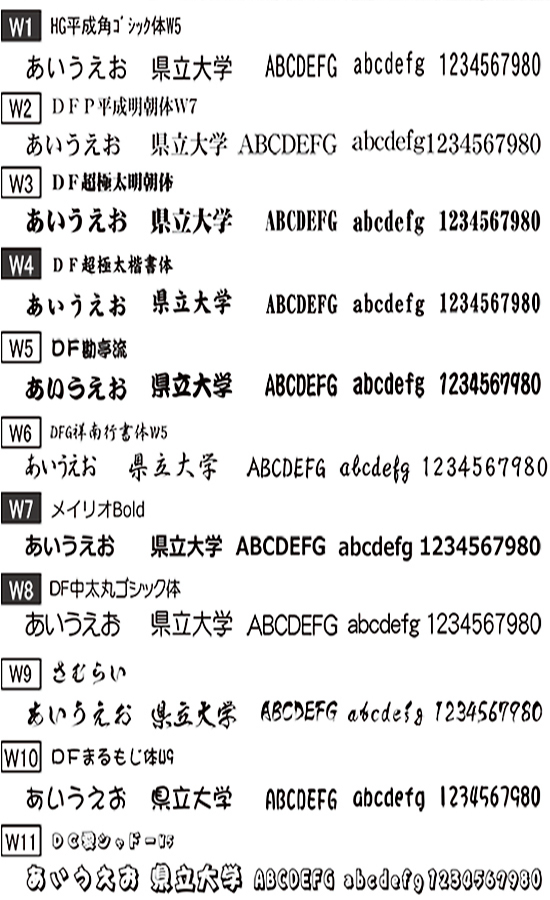 | フォント(書体)は記号と書体名でご指示ください。 例:W1 HG平成角ゴシック隊W5 | |