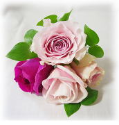 ◆ラウンドブーケ(408) バラ(イブピアッチェ・ピンクイブピアッチェ・クレア) スプレーバラ(サントワマミー)・レモンリーフ ¥27.000 |
