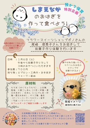 | 15時15分頃、設定保育終了を目途におやつとします。(おやつは幼稚園で準備致します。) |