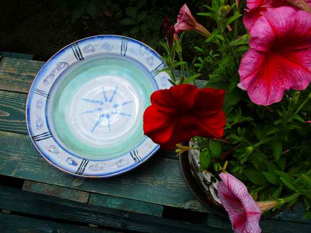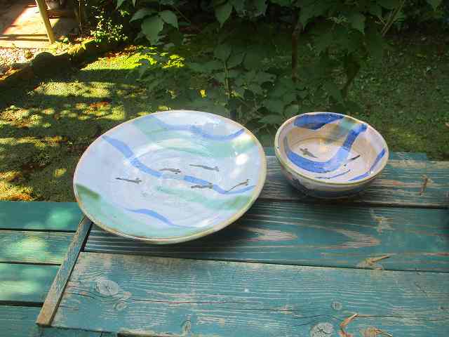 ここにあるお皿の径は24cmですからまあ中皿の類です。一緒の窯で共に励ましあってくれた小鉢と同じ系統の絵を施してやったところまあ、損傷なく仕上がってくれました。