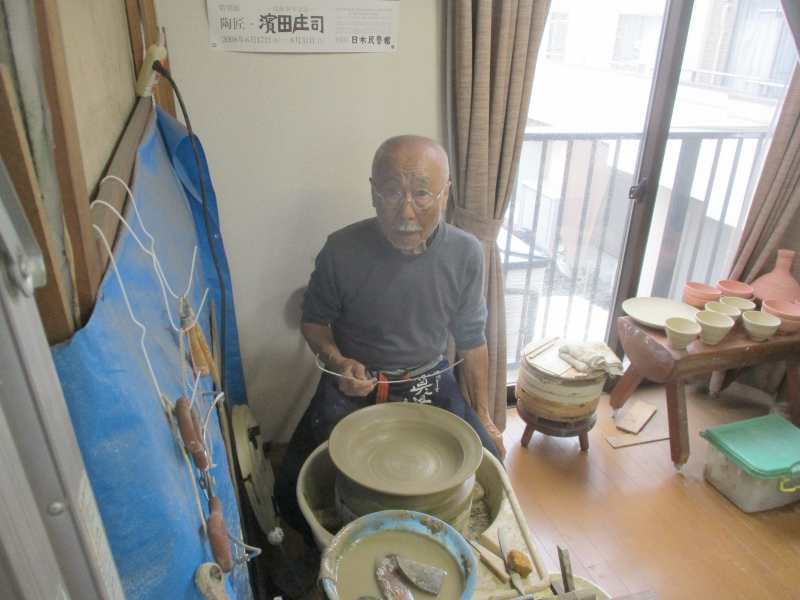 釉薬をかける作業もそうです、片手でいとも簡単に大皿を掴んでひしゃくの泥漿を掛けながらその皿を回して均一に施釉する・・怪物のなせる業です。