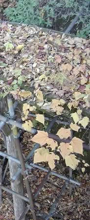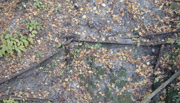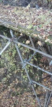 (通行不可能な木橋が枯れ葉をまとっている)