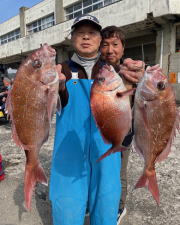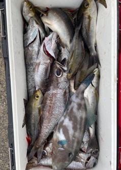 | 4月17日(金) コマセ五目で出船 朝一から水温は20℃超え、潮速く前半は釣りにならず・・・(T_T) 後半潮たるみイサキ多点掛けで入れ食いタイムあり!皆さんしっかりお土産釣れたよう・・・。最後はマダイ狙いで、1kg前後中心に楽しめました。バラシもあったようで残念でした。他メジナ・ウマヅラハギ等 |