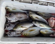| 4月8日(水) 黒ムツ・五目で出船! イサキと美味しいお魚(^^)v 黒ムツから入って、反応あるものの型を見た程度・・(T_T) 早めに美味しいお魚へ行き、こちらは多点掛けで入れ食いでした。全員お土産十分だと思います。他アジ。その後黒ムツに戻ってみましたが残念でした コマセ五目はイサキが大・中・小まじりで多点掛け入れ食い。飽きてしまったようで最後はマダイとマハタ狙ってみましたが小型のみでした。他カサゴ・メジナ・ウマヅラハギ等 |
