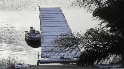 | モーターボートにシートをかけてさくら湖は冬ごもりです。桟橋の先の方にはカワウの糞害を防ぐ網を張りました。 | |