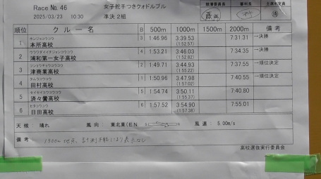 | 25年3月22日 | 今日の天気は晴れでしたが、少し風が横から吹く条件で女子クオドの予選のレースが行われました。予選は田村、青森西、川口市立、本所、洲本、浦和第一女子の6クルーの出漕でした。スタートから本所がリードし、浦和第一女子と川口市立が続く展開でした。田村は1000mを4位で通過し、徐々に追い上げゴール前では川口市立を0.5秒差まで迫りましたが無念の4位でのゴールでした。タイムは8分1秒でした。午後の敗者復活戦では田村、諏訪清陵、大津、鳥取東、青森の5クルーの出漕でした。スタートから大津がリードし、諏訪清陵、鳥取東と続き、田村は1000m地点では予選同様4位の通過でした。その後徐々に追い上げ、1500m以降で一気にごぼう抜きして1位でゴールし明日の準決勝に進みました。タイムは8分11秒でした。 |